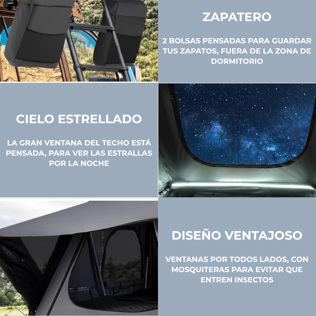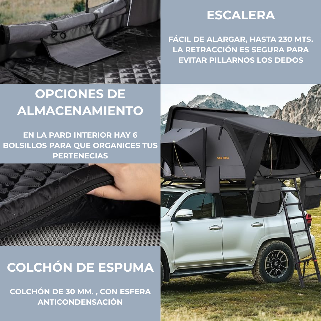 Incluye la tienda de techo San Hima, colchón, escalera telescópica de 2,3 m, luz LED interior, alfombra anticondensación y todos los accesorios de montaje.